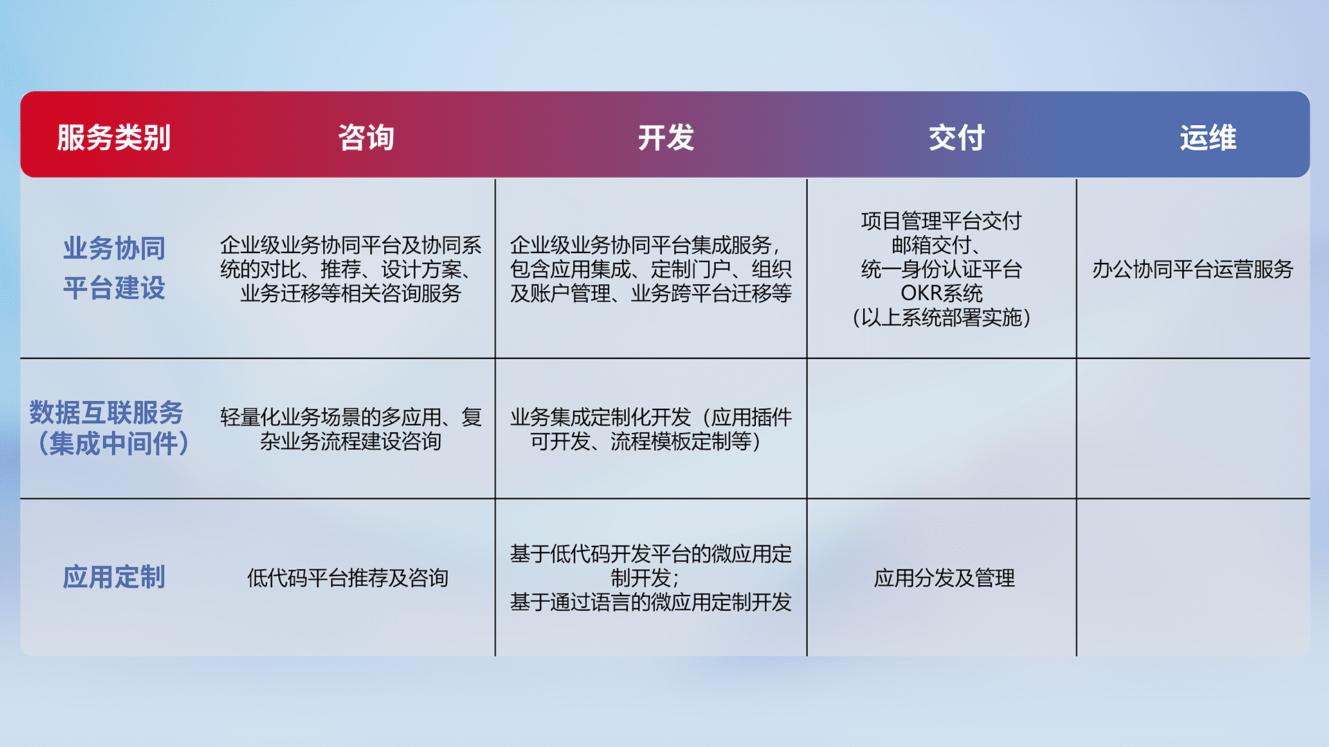 针对钉钉、、企微、、、IDaas等平台级产品提供产品的规划、、、、方案、、、、交付、、、定制化开发等服务,,,实现如统一协同办公、、、、智能客户服务、、混合会议管理、、、、智能数据查询、、、等业务场景,,实现数字化转型。。。。