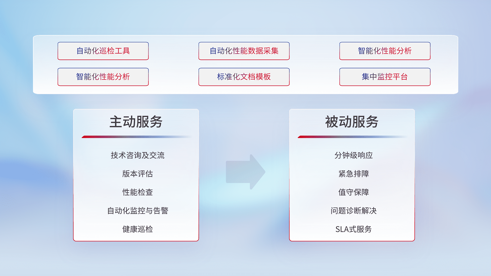 智能化工具和标准化文档,,,,保障服务质量,,提供主动服务(包含技术咨询、、、、版本评估、、、、性能检查、、、、自动化监控与告警、、、、健康巡检)和被动服务包含(分钟级响应、、、、紧急排障、、、值守保障、、、问题诊断解决、、、SLA服务)。。