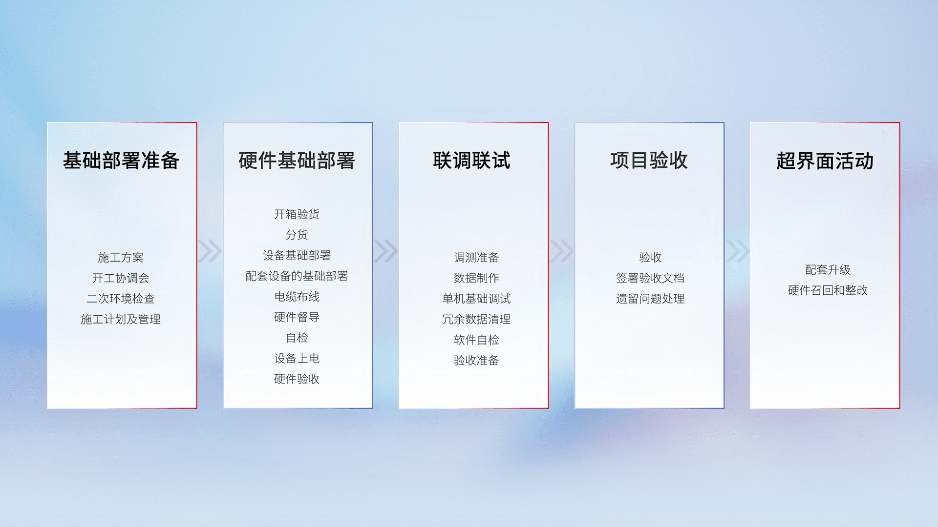 从基础部署准备、、、、硬件基础部署、、、联调联试、、、项目验收、、越界面活动的全过程可追溯,,,保证施工质量和进度。。。。